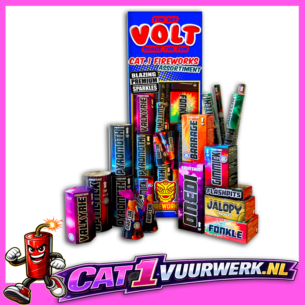 Royaal assortiment categorie 1 vuurwerk met oa fakkels, crackers en fonteinen.